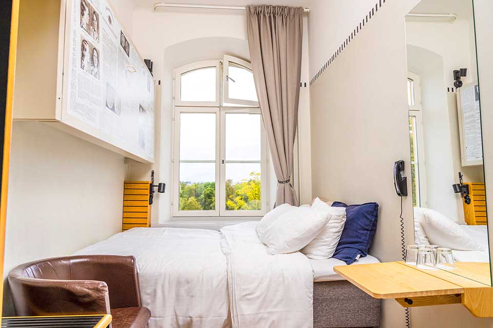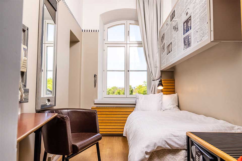 “CELLdom” seen captivating accommodation: A genuine single cell with bold design solutions with captivating overtones. Sleep in a single bed or in a cell with bunk beds if there are two of you. The cells have TV, shower & WC, good working areas and a practical safety box with electrical socket as well as free Wi-Fi.