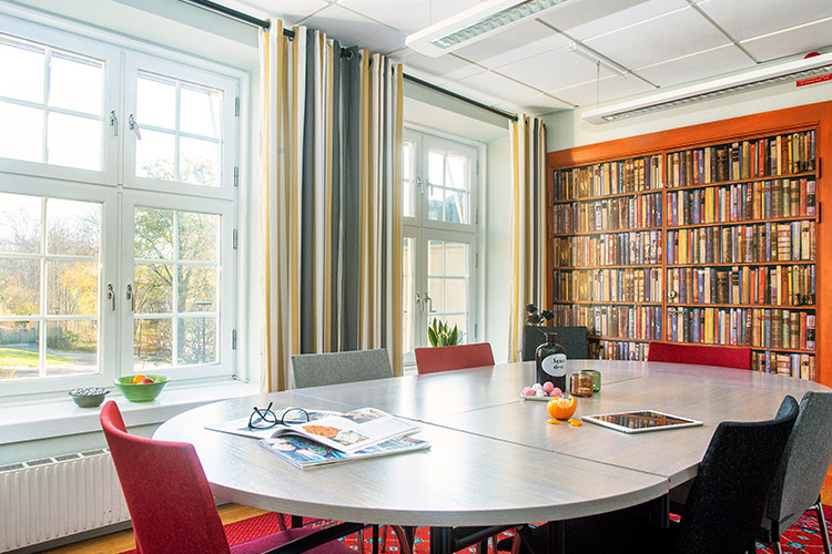 Konferensrummet Strömstedt ligger precis innan festvåningen, där förmiddagskaffet dukas upp. Ett trevligt rum för trevliga möten.